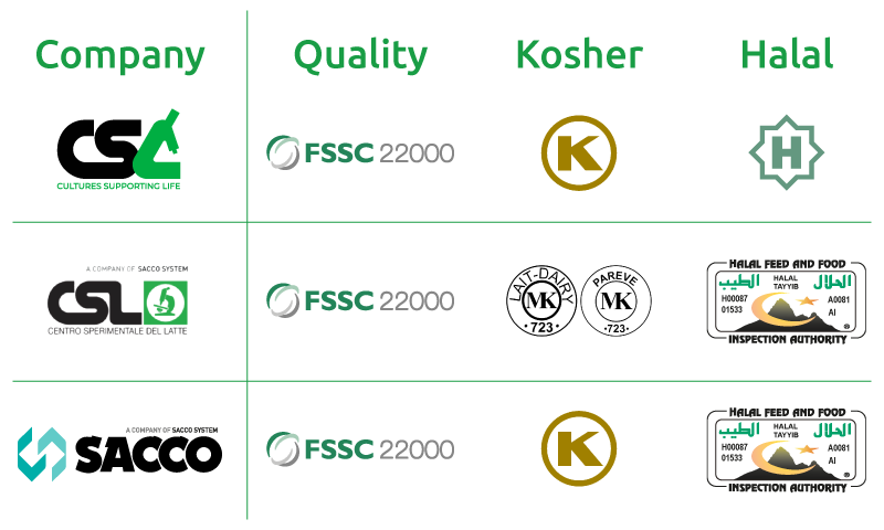 In confirmation of its strong commitment to quality, CSL USA has achieved key certifications over the years, both in terms of quality and religious compliance. Here are the details for each company: